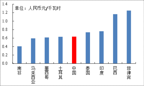 從工(gong)(gong)業用戶銷售電(dian)價看,2019年,新興工(gong)(gong)業化(hua)國(guo)(guo)家的工(gong)(gong)業電(dian)價平(ping)(ping)均為(wei)(wei)每千瓦(wa)時0.755元,較(jiao)OECD國(guo)(guo)家平(ping)(ping)均水(shui)平(ping)(ping)低(di)16.8%。我國(guo)(guo)為(wei)(wei)0.635元,占各國(guo)(guo)平(ping)(ping)均水(shui)平(ping)(ping)的84%,高于南非和馬來西亞(ya),與墨西哥和土耳其(qi)大(da)體相(xiang)當,低(di)于其(qi)他4國(guo)(guo)。