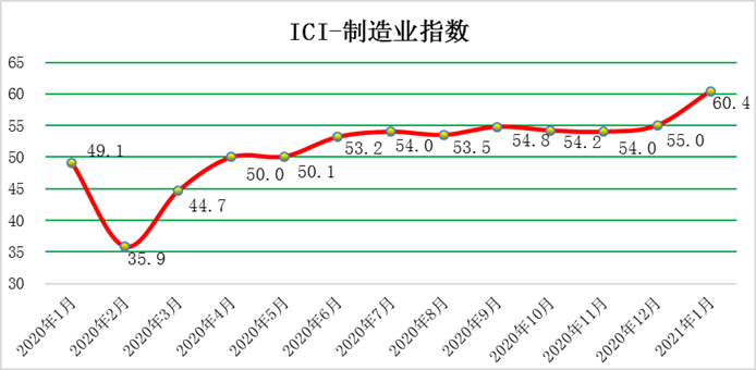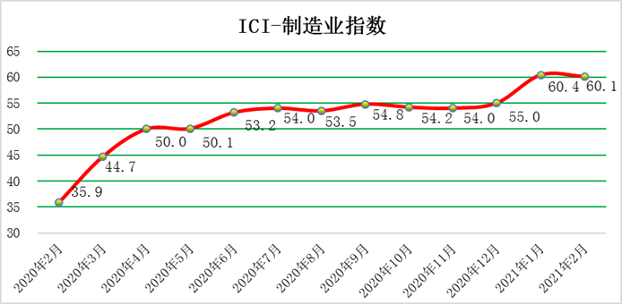 2月份ICI制(zhi)造業指數為60.1%,環(huan)比回(hui)落(luo)0.3個百分(fen)點,持續高(gao)于榮(rong)枯線(xian)。2021年 2月官方制(zhi)造業 PMI 為 50.6%,較前值回(hui)落(luo) 0.7個百分(fen)點,連續 3個月回(hui)落(luo),但仍(reng)然維(wei)持在(zai)榮(rong)枯線(xian)以(yi)上。