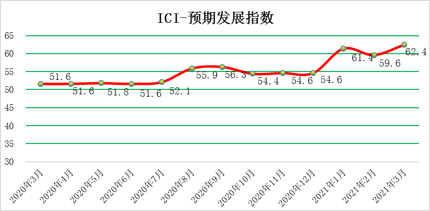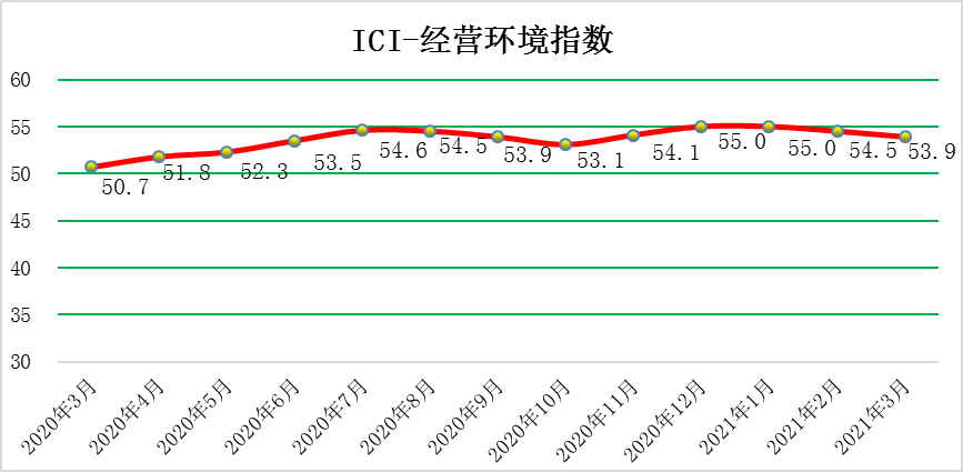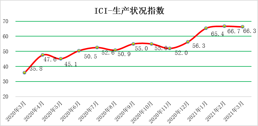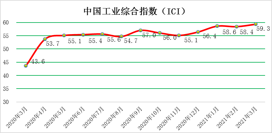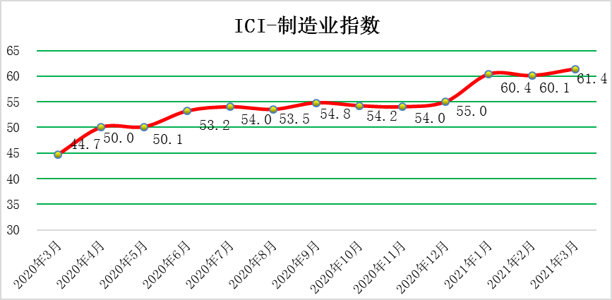 2021年(nian)3月(yue)(yue)份,中(zhong)國(guo)工業(ye)綜合指(zhi)數(shu)(以(yi)下簡稱ICI)為59.3%,環(huan)(huan)(huan)(huan)比(bi)(bi)上漲0.9個(ge)(ge)百(bai)分(fen)(fen)(fen)點(dian)(dian),春節效應(ying)影響消除,增速短期(qi)加快,同時自去(qu)年(nian)4月(yue)(yue)份以(yi)來連(lian)續(xu)(xu)(xu)(xu)位(wei)(wei)于(yu)榮(rong)(rong)(rong)枯線(xian)以(yi)上,表(biao)明中(zhong)國(guo)工業(ye)經(jing)濟總體持續(xu)(xu)(xu)(xu)恢復。生(sheng)產狀況指(zhi)數(shu)為66.3%,環(huan)(huan)(huan)(huan)比(bi)(bi)下降(jiang)0.4個(ge)(ge)百(bai)分(fen)(fen)(fen)點(dian)(dian),稍有(you)回(hui)落(luo)但(dan)繼續(xu)(xu)(xu)(xu)保持高(gao)位(wei)(wei),企業(ye)生(sheng)產活動積極(ji)平穩進行。效益狀況指(zhi)數(shu)為52.6%,環(huan)(huan)(huan)(huan)比(bi)(bi)上漲0.1個(ge)(ge)百(bai)分(fen)(fen)(fen)點(dian)(dian),小幅回(hui)升(sheng)。經(jing)營(ying)環(huan)(huan)(huan)(huan)境指(zhi)數(shu)為53.9 %,環(huan)(huan)(huan)(huan)比(bi)(bi)回(hui)落(luo)0.6個(ge)(ge)百(bai)分(fen)(fen)(fen)點(dian)(dian),連(lian)續(xu)(xu)(xu)(xu)位(wei)(wei)于(yu)榮(rong)(rong)(rong)枯線(xian)之(zhi)上,反(fan)映了市(shi)場經(jing)營(ying)環(huan)(huan)(huan)(huan)境持續(xu)(xu)(xu)(xu)改(gai)善。融(rong)資(zi)難易指(zhi)數(shu)為48.8%,環(huan)(huan)(huan)(huan)比(bi)(bi)上漲1.6個(ge)(ge)百(bai)分(fen)(fen)(fen)點(dian)(dian),持續(xu)(xu)(xu)(xu)位(wei)(wei)于(yu)榮(rong)(rong)(rong)枯線(xian)下方,且(qie)該指(zhi)數(shu)仍低(di)于(yu)50%的(de)均衡線(xian),表(biao)明當前企業(ye)融(rong)資(zi)難融(rong)資(zi)貴的(de)問(wen)題持續(xu)(xu)(xu)(xu)存在(zai),針對此難題還需更有(you)效的(de)貨(huo)幣、財政(zheng)政(zheng)策等。預期(qi)發展指(zhi)數(shu)為62.4 %,環(huan)(huan)(huan)(huan)比(bi)(bi)上漲2.8個(ge)(ge)百(bai)分(fen)(fen)(fen)點(dian)(dian),大幅上漲且(qie)該指(zhi)數(shu)依(yi)舊長(chang)期(qi)保持高(gao)位(wei)(wei)優(you)勢(shi)。ICI制造業(ye)指(zhi)數(shu)為61.4%,環(huan)(huan)(huan)(huan)比(bi)(bi)上漲1.3個(ge)(ge)百(bai)分(fen)(fen)(fen)點(dian)(dian),繼續(xu)(xu)(xu)(xu)處(chu)于(yu)高(gao)位(wei)(wei),自去(qu)年(nian)4月(yue)(yue)份以(yi)來連(lian)續(xu)(xu)(xu)(xu)位(wei)(wei)于(yu)榮(rong)(rong)(rong)枯線(xian)以(yi)上,表(biao)明制造業(ye)總體持續(xu)(xu)(xu)(xu)回(hui)暖。