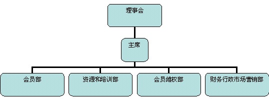 理事會下設協會主席職位,具體執行理事會決定,并負責協會日常事務。協會主席之下常設四個部門:會員部、資源和培訓部、會員維權部、財務行政市場營銷部等,在主席領導下工作。圖示如下。
