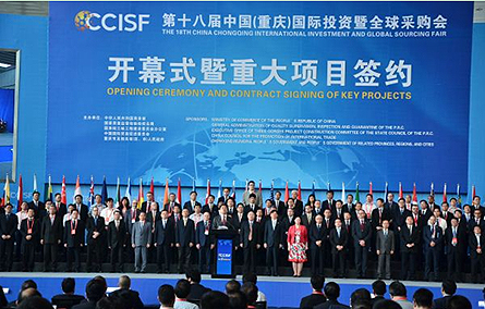 5月29日,第(di)十八(ba)屆中國(guo)(guo)(重慶)國(guo)(guo)際投資暨全球(qiu)采購會(hui)(簡稱(cheng)“渝(yu)洽會(hui)”)開幕(mu)式暨重大(da)項目簽(qian)約儀式在重慶國(guo)(guo)際博覽中心(xin)舉行。本屆渝(yu)洽會(hui)以(yi)“互聯互通、全球(qiu)合作”為主題,吸引了21個國(guo)(guo)家和地區、國(guo)(guo)內(nei)31個省區市政府代表團(tuan)、6800多家企業(ye)組團(tuan)參會(hui)。國(guo)(guo)務院國(guo)(guo)資委(wei)(wei)黨(dang)委(wei)(wei)委(wei)(wei)員(yuan)、秘書長閻(yan)曉峰應邀(yao)出席(xi)。