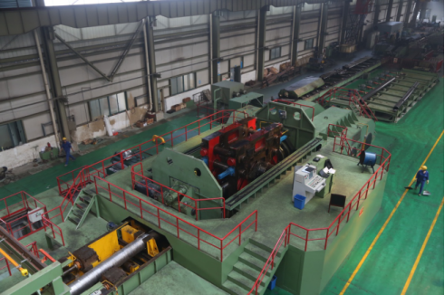 國機集團經過多年聯合攻關,掌握重型大口徑LG-730冷軋無縫管關鍵技術,取得了多項創新成果:一是提出具有極大運動慣量的雙軸平衡理論和優化配重策略,解決重達140噸的機架高速往復軋制交變慣性力平衡問題,慣性力峰值降低約70%。二是解決大慣量冷軋管機交變沖擊載荷下回轉、送進系統不可靠難題,實現30m大直徑回轉體、大口徑管材間歇送料與高速連續軋制機構的協同耦合,φ730mm最大成品管外徑偏差±0.6mm,壁厚偏差±0.5mm。三是提出適于大噸位管坯側向上料的新方法及相配套芯棒桿鎖定與調整機構,解決了大口徑管坯端部上料時因內外表面頻繁、嚴重劃傷導致的廢品率高、上料時間長、效率低等問題。四是首次建立基于軋制力沿變形區均衡分布的大口徑冷軋管孔型設計模型,構建大口徑管材孔型設計工藝數據庫,在國際上首次實現最大外徑φ730mm、最大壁厚50mm的大口徑高品質冷軋無縫管材的工業化生產。
