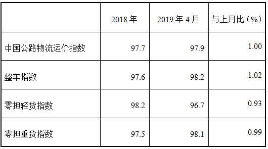 表1 2019年(nian)4月(yue)中國公路(lu)物流(liu)運(yun)價指數表