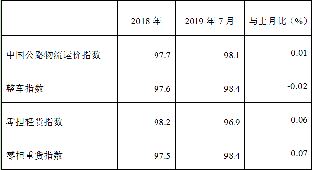 表1 2019年(nian)7月中國公路物流運價(jia)指(zhi)數表