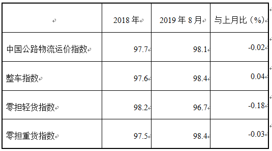 表(biao)1 2019年8月中國公路(lu)物(wu)流運價指數表(biao)