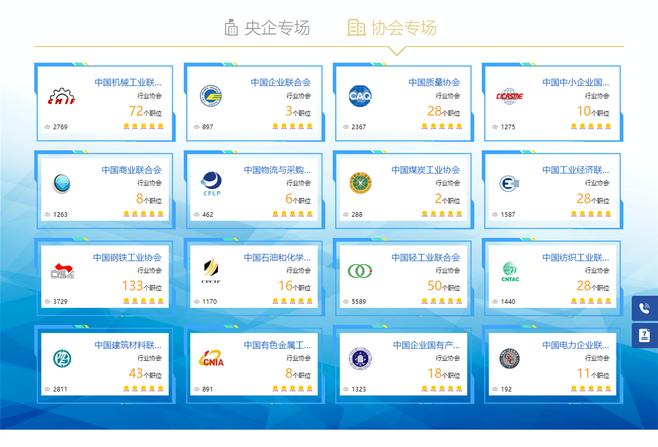 在(zai)(zai)統籌推(tui)進疫情防(fang)控和經濟社會(hui)(hui)發(fa)展工作中(zhong)(zhong),國資委聯(lian)系(xi)的行(xing)(xing)業(ye)(ye)協會(hui)(hui)充分(fen)(fen)發(fa)揮(hui)“中(zhong)(zhong)字頭”協會(hui)(hui)影響(xiang)力大、聯(lian)系(xi)的企(qi)(qi)(qi)(qi)業(ye)(ye)覆蓋面廣(guang)的優勢(shi),迅(xun)速(su)行(xing)(xing)動(dong)(dong)(dong),在(zai)(zai)自身提(ti)供就業(ye)(ye)崗位(wei)(wei)(wei)的同時,積(ji)極帶動(dong)(dong)(dong)行(xing)(xing)業(ye)(ye)企(qi)(qi)(qi)(qi)業(ye)(ye)參(can)與網絡(luo)招聘(pin)專項(xiang)活(huo)(huo)動(dong)(dong)(dong)。煤炭、商業(ye)(ye)、鋼(gang)(gang)鐵、企(qi)(qi)(qi)(qi)聯(lian)、電(dian)力、工經聯(lian)、中(zhong)(zhong)小、輕工、紡織、機械、石化、有(you)(you)色、產權等直管協會(hui)(hui)紛紛通過協會(hui)(hui)網站、行(xing)(xing)業(ye)(ye)報刊、公眾號、微信群等多(duo)(duo)(duo)渠道(dao),發(fa)布倡議、擴(kuo)(kuo)(kuo)大宣傳,鼓勵行(xing)(xing)業(ye)(ye)內(nei)用人(ren)單位(wei)(wei)(wei)參(can)與穩崗擴(kuo)(kuo)(kuo)就業(ye)(ye)網絡(luo)招聘(pin)活(huo)(huo)動(dong)(dong)(dong),幫助行(xing)(xing)業(ye)(ye)內(nei)用人(ren)單位(wei)(wei)(wei)擴(kuo)(kuo)(kuo)大招聘(pin)渠道(dao),緩解行(xing)(xing)業(ye)(ye)企(qi)(qi)(qi)(qi)業(ye)(ye)在(zai)(zai)疫情期間(jian)的用人(ren)困難。鋼(gang)(gang)鐵協會(hui)(hui)聞令而動(dong)(dong)(dong),率先組(zu)織行(xing)(xing)業(ye)(ye)內(nei)院校(xiao)、地(di)方國有(you)(you)企(qi)(qi)(qi)(qi)業(ye)(ye)、民營企(qi)(qi)(qi)(qi)業(ye)(ye)參(can)加專項(xiang)網絡(luo)招聘(pin)活(huo)(huo)動(dong)(dong)(dong);商業(ye)(ye)聯(lian)合(he)會(hui)(hui)分(fen)(fen)批推(tui)進,對(dui)用人(ren)需(xu)求(qiu)較(jiao)多(duo)(duo)(duo)會(hui)(hui)員(yuan)(yuan)單位(wei)(wei)(wei)重點關(guan)注,吸引了沃爾瑪中(zhong)(zhong)國總部及四大區和山姆會(hui)(hui)員(yuan)(yuan)店發(fa)布900多(duo)(duo)(duo)個(ge)人(ren)才(cai)需(xu)求(qiu);電(dian)力聯(lian)合(he)會(hui)(hui)動(dong)(dong)(dong)員(yuan)(yuan)會(hui)(hui)員(yuan)(yuan)單位(wei)(wei)(wei)及其分(fen)(fen)公司、分(fen)(fen)支機構,共(gong)同參(can)與并發(fa)布招聘(pin)計(ji)劃;煤炭協會(hui)(hui)組(zu)織7家會(hui)(hui)員(yuan)(yuan)單位(wei)(wei)(wei)持(chi)續發(fa)力,累計(ji)提(ti)供了800多(duo)(duo)(duo)個(ge)崗位(wei)(wei)(wei)和2300多(duo)(duo)(duo)個(ge)人(ren)才(cai)需(xu)求(qiu)。一個(ge)多(duo)(duo)(duo)月來(lai),已有(you)(you)包括(kuo)陜鋼(gang)(gang)、本(ben)鋼(gang)(gang)、蘇寧易(yi)購、雙匯、平安、鏈家、飛行(xing)(xing)幫、穩健醫(yi)療等知名企(qi)(qi)(qi)(qi)業(ye)(ye)在(zai)(zai)內(nei)的,近120家地(di)方國有(you)(you)企(qi)(qi)(qi)(qi)業(ye)(ye)、民營企(qi)(qi)(qi)(qi)業(ye)(ye)、外資企(qi)(qi)(qi)(qi)業(ye)(ye)、大中(zhong)(zhong)專院校(xiao)等會(hui)(hui)員(yuan)(yuan)單位(wei)(wei)(wei)參(can)與專項(xiang)網絡(luo)招聘(pin)活(huo)(huo)動(dong)(dong)(dong)。