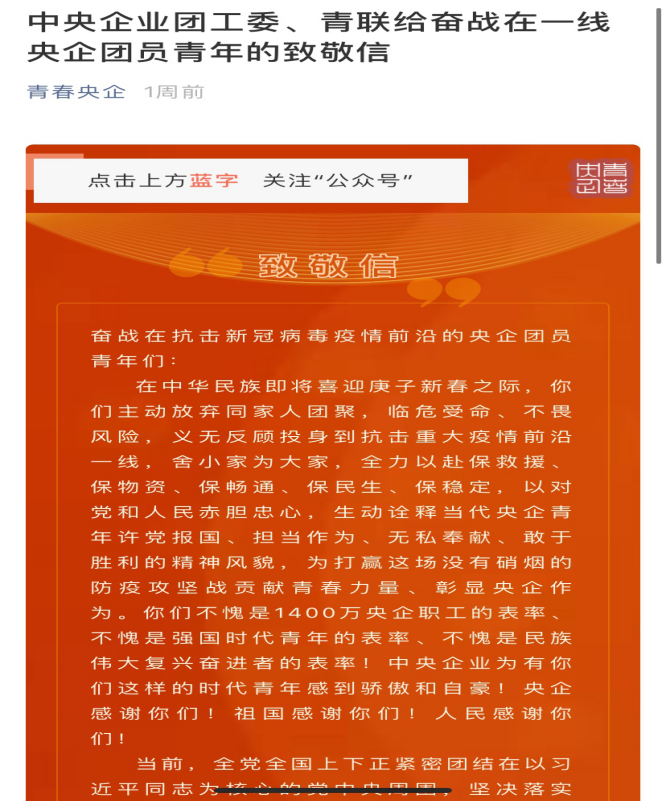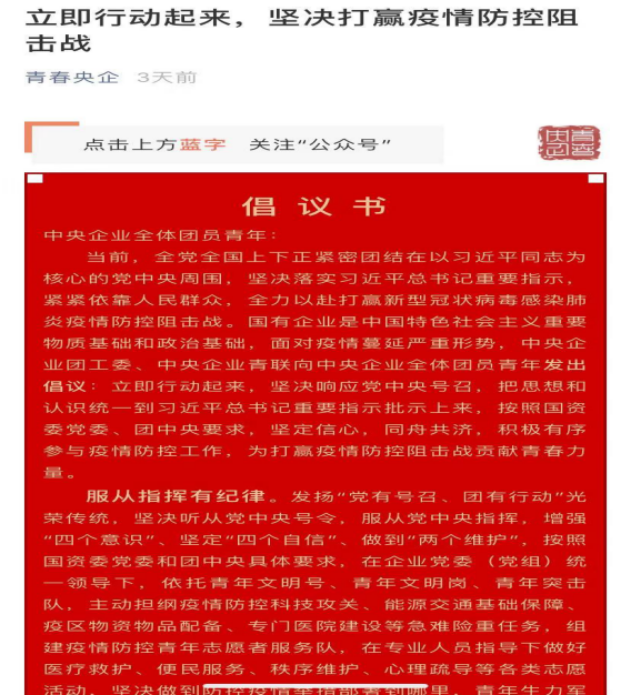 按照(zhao)國資(zi)委(wei)黨委(wei)部署,1月29日(ri),中央(yang)企(qi)業(ye)(ye)團工委(wei)、中央(yang)企(qi)業(ye)(ye)青聯發出《致中央(yang)企(qi)業(ye)(ye)全體團員青年倡議書》,“堅定信心,同舟共濟(ji),積極有序(xu)參與疫情防控(kong)工作(zuo),為打贏(ying)疫情防控(kong)阻(zu)擊戰(zhan)貢獻青春力量”,吹(chui)響(xiang)央(yang)企(qi)青年戰(zhan)“疫”攻堅號(hao)角。