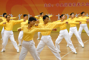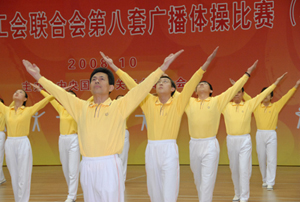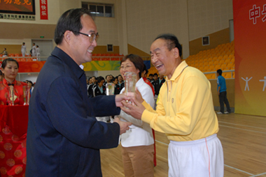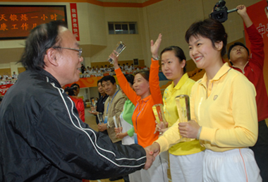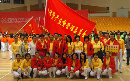 2008年10月12日下午,中央國家機關(第八套)廣播體操總決賽在北京地壇體育館隆重舉行。國資委黨委委員李壽生同志親臨比賽現場并參加決賽。國資委直屬機關代表隊全體同志精神煥發、斗志昂揚、齊心協力、相互配合,與日前經過復賽從80多部委代表隊脫穎而出取得決賽權19個部委代表隊同場競技,比出了風格,賽出了水平。不但全隊榮獲三等獎,而且授予李壽生同志“特別獎”,以表彰中央國家機關部委領導帶頭開展“全民健身”運動的模范作用。 |