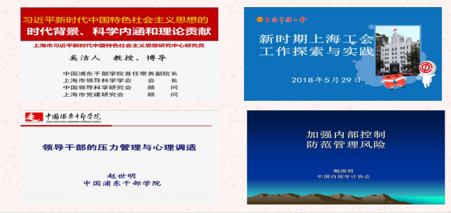 培訓(xun)班采取專題講座(zuo)(zuo)、實(shi)地教學(xue)、研(yan)討交流(liu)等多(duo)種形式,內容全(quan)面豐富,具有很強的(de)針對(dui)性(xing)(xing)、指(zhi)導性(xing)(xing)和(he)實(shi)用(yong)性(xing)(xing)。培訓(xun)班邀請中國(guo)浦東(dong)干(gan)部(bu)學(xue)院首任(ren)常務(wu)副院長奚潔人作(zuo)《認(ren)真(zhen)學(xue)習貫徹習近平新時(shi)代中國(guo)特(te)色社會(hui)(hui)(hui)(hui)(hui)主義思想》專題輔導報(bao)告,上海市(shi)總工會(hui)(hui)(hui)(hui)(hui)副主席、經審會(hui)(hui)(hui)(hui)(hui)主任(ren)桂曉燕講授《新時(shi)期工會(hui)(hui)(hui)(hui)(hui)工作(zuo)的(de)探(tan)索和(he)實(shi)踐》,中國(guo)內部(bu)審計協會(hui)(hui)(hui)(hui)(hui)副會(hui)(hui)(hui)(hui)(hui)長兼秘書長鮑國(guo)明作(zuo)《加強工會(hui)(hui)(hui)(hui)(hui)會(hui)(hui)(hui)(hui)(hui)費(fei)內部(bu)控制,防(fang)范管理風險》專題講座(zuo)(zuo),中國(guo)浦東(dong)干(gan)部(bu)學(xue)院教研(yan)部(bu)主任(ren)趙世明講授《領導干(gan)部(bu)的(de)心(xin)理調適與(yu)緩解》。