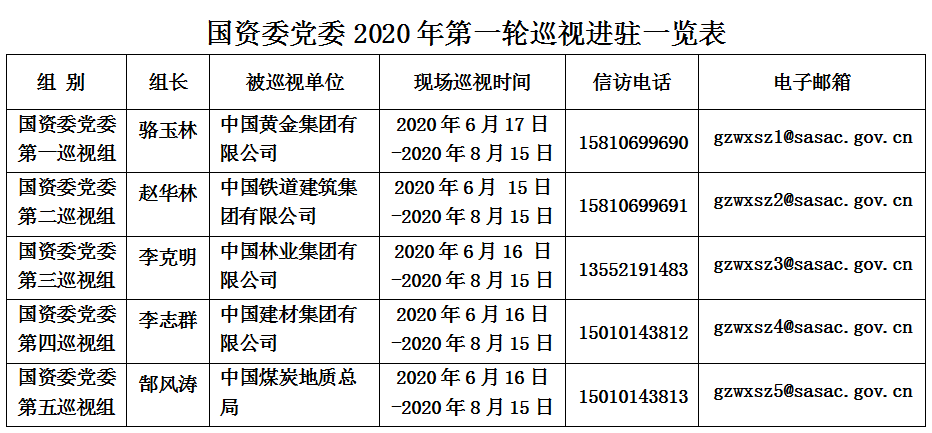 根據黨(dang)(dang)中央關(guan)于(yu)巡視(shi)工(gong)作(zuo)的(de)決策部署,按照國(guo)(guo)(guo)資委黨(dang)(dang)委工(gong)作(zuo)安排,6月中旬,以(yi)李(li)志群、郜(gao)鳳濤、李(li)克(ke)明、趙華林、駱(luo)玉林為巡視(shi)組(zu)(zu)組(zu)(zu)長的(de)國(guo)(guo)(guo)資委黨(dang)(dang)委巡視(shi)組(zu)(zu),進駐中國(guo)(guo)(guo)建材集團有限公(gong)司(si)、中國(guo)(guo)(guo)鐵(tie)道建筑集團有限公(gong)司(si)、中國(guo)(guo)(guo)林業集團有限公(gong)司(si)、中國(guo)(guo)(guo)煤炭(tan)地質總局、中國(guo)(guo)(guo)黃金集團有限公(gong)司(si)等5家中央企業黨(dang)(dang)委開(kai)展常規巡視(shi)。