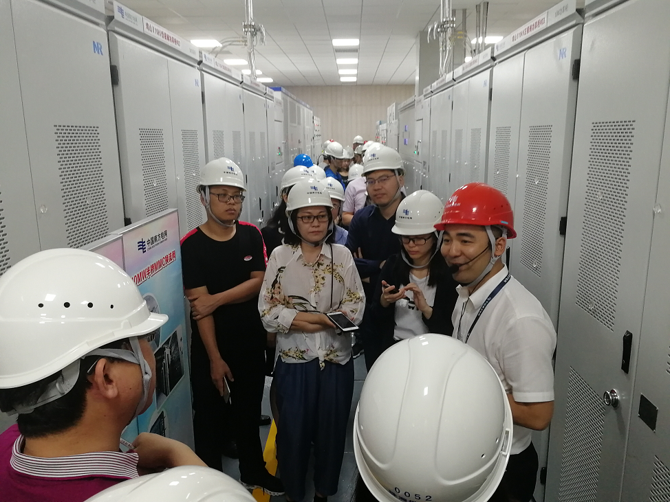 珠海供電局工作人(ren)員(yuan)向媒(mei)體(ti)團介紹唐(tang)家灣(wan)柔直配(pei)網工程