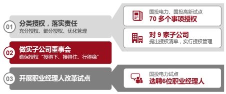 按(an)照(zhao)習近平總書記“國企(qi)改(gai)(gai)革(ge)要(yao)以增強企(qi)業(ye)活力、提高效率為中心”的(de)要(yao)求,國投(tou)結合自(zi)身業(ye)務特點(dian),在改(gai)(gai)革(ge)試點(dian)中提出(chu)了(le)“分(fen)(fen)(fen)類(lei)授(shou)(shou)權(quan)(quan)改(gai)(gai)革(ge)”、“授(shou)(shou)權(quan)(quan)改(gai)(gai)革(ge)與(yu)建立有制衡(heng)的(de)法(fa)人治理(li)結構相結合”、“授(shou)(shou)權(quan)(quan)改(gai)(gai)革(ge)與(yu)監督(du)改(gai)(gai)革(ge)同步(bu)推進”等(deng)綜合改(gai)(gai)革(ge)措施。通過對(dui)(dui)經(jing)營(ying)(ying)單位(wei)進行量化評價,對(dui)(dui)所(suo)屬14家子(zi)(zi)公(gong)司(si)按(an)照(zhao)一(yi)企(qi)一(yi)策的(de)原則(ze),全部(bu)實施了(le)分(fen)(fen)(fen)類(lei)授(shou)(shou)權(quan)(quan)經(jing)營(ying)(ying)。其中對(dui)(dui)2家充分(fen)(fen)(fen)授(shou)(shou)權(quan)(quan)類(lei)子(zi)(zi)公(gong)司(si),將投(tou)資決(jue)策權(quan)(quan)、選人用人權(quan)(quan)、薪酬分(fen)(fen)(fen)配權(quan)(quan)等(deng)70多(duo)類(lei)事項,全部(bu)授(shou)(shou)權(quan)(quan)子(zi)(zi)公(gong)司(si)董事會決(jue)策;將延伸到(dao)三(san)級及以下(xia)投(tou)資企(qi)業(ye)的(de)管理(li)事項,原則(ze)上交由(you)子(zi)(zi)公(gong)司(si)依(yi)法(fa)依(yi)規決(jue)策,推動決(jue)策責任歸位(wei)和管理(li)責任到(dao)位(wei),依(yi)法(fa)落(luo)實子(zi)(zi)公(gong)司(si)的(de)市場經(jing)營(ying)(ying)主體地位(wei),建立權(quan)(quan)責對(dui)(dui)等(deng)、運轉協調、有效制衡(heng)的(de)決(jue)策執(zhi)行監督(du)機(ji)制,適合市場與(yu)企(qi)業(ye)自(zi)身特點(dian)的(de)經(jing)營(ying)(ying)管理(li)運行機(ji)制。