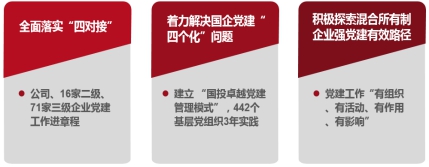 國投在改革試點中全面加強黨的建設,將黨的領導有效融入公司治理各個環節,明確和落實黨組織在公司法人治理結構中的法定地位、黨組對重大事項的前置審議程序,黨組與董事會、總經理的權責邊界,完善了黨組織議事規則、“三重一大”決策等機制,黨組織參與重大決策實現了制度化,實現了管資本與管黨建有機融合。國投創新黨員學習教育、組織生活、自我監督評價等管理方法,搭建互聯網平臺,把黨建基礎工作固化在云平臺上,實現黨員在線學習交流;運用主題實踐、陣地建設、黨群共建、融合創新、典型示范五大載體,創建150多個黨建活動項目,供基層黨組織選擇開展;將黨建和黨風廉政建設履責情況與績效考核掛鉤,月反饋、季檢查、年通報。總結出的“卓越黨建管理”,為基層黨組織提供了一套新型黨建工作方法,增強了基層黨組織的戰斗堡壘作用,筑牢了企業的“根”和“魂”。得到了中組部和國資委的認可和肯定,有關經驗做法由黨建讀物出版社出版發行。國投積極探索混合所有制企業加強黨建的有效途徑,按照國有資本投到哪,黨組織就建到哪,健全的組織生活就開展到哪的要求,混合所有制企業黨建工作做到了“有組織、有活動、有作用、有影響”。