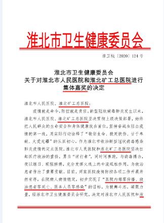 2月(yue)23日,華(hua)潤醫療淮北(bei)礦工(gong)總醫院(yuan)抗(kang)擊(ji)疫(yi)情獲淮北(bei)市衛生健康(kang)委員會嘉獎。
