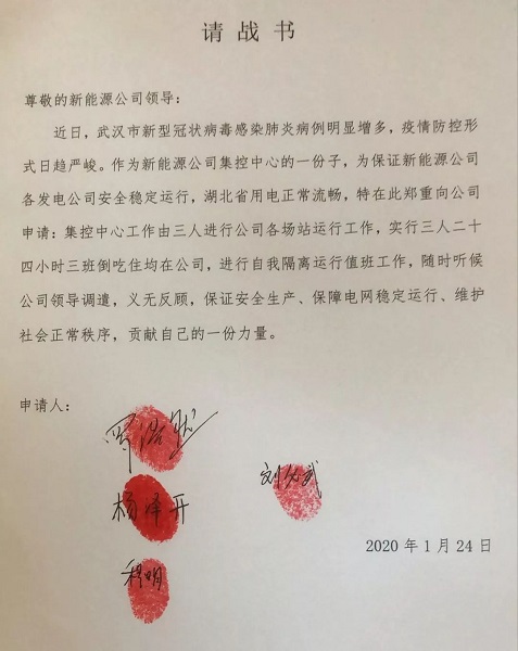 在(zai)這次“抗疫保電(dian)”的(de)(de)(de)工作中(zhong),面(mian)對(dui)復雜嚴峻的(de)(de)(de)疫情,羅浩然(ran)毫不(bu)猶豫放棄了(le)春節假期,主(zhu)動(dong)請(qing)纓,帶(dai)(dai)領集控中(zhong)心(xin)(xin)其(qi)他3名(ming)(ming)值(zhi)班(ban)員(yuan),寫下請(qing)戰(zhan)書(shu),要求堅守在(zai)“抗疫保電(dian)”第一線。1月(yue)23日,武漢(han)“封城”。1月(yue)24日,湖北(bei)省啟動(dong)重大(da)(da)突發公共衛生事件一級應(ying)(ying)急響應(ying)(ying)。面(mian)對(dui)不(bu)斷蔓延的(de)(de)(de)疫情,公司(si)面(mian)臨著防疫和保電(dian)的(de)(de)(de)雙重壓(ya)力,羅浩然(ran)所在(zai)的(de)(de)(de)集控中(zhong)心(xin)(xin)承擔著公司(si)19個投(tou)運風(feng)電(dian)場及光伏電(dian)站生產管理的(de)(de)(de)中(zhong)樞(shu)功能(neng)(neng)。“疫情就(jiu)是命(ming)令(ling),防控就(jiu)是責任(ren)。”由(you)于(yu)集控中(zhong)心(xin)(xin)位(wei)于(yu)武漢(han)徐東大(da)(da)街的(de)(de)(de)湖北(bei)能(neng)(neng)源大(da)(da)廈,為避(bi)免換班(ban)及路途往返造成的(de)(de)(de)感染風(feng)險,經公司(si)同(tong)意,羅浩然(ran)調整值(zhi)班(ban)安排,帶(dai)(dai)領兩名(ming)(ming)值(zhi)班(ban)員(yuan)24小時在(zai)集控中(zhong)心(xin)(xin)值(zhi)班(ban)。