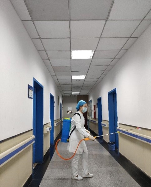 趙杰正在(zai)給(gei)隔離病房消毒(du)