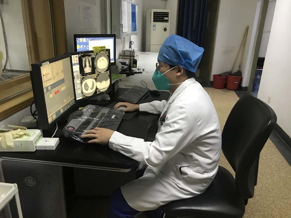 王(wang)坤在(zai)CT室給患者做肺CT檢查