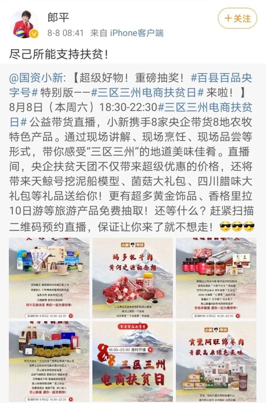 自啟動以來,本次直(zhi)播帶貨(huo)便吸引了眾多網(wang)友的(de)關(guan)注,同時也受到了社會(hui)各(ge)界愛心人(ren)(ren)(ren)士的(de)支持。全國(guo)脫貧攻堅獎獲得者、“人(ren)(ren)(ren)民楷模”高德(de)榮,“當代雷鋒(feng)”“改革先鋒(feng)”郭明(ming)義,“時代楷模”張黎明(ming),“全國(guo)道(dao)德(de)模范(fan)”、中(zhong)(zhong)國(guo)摩天大(da)樓鋼構(gou)第一人(ren)(ren)(ren)陸(lu)建新,著名演員、導(dao)演吳京,中(zhong)(zhong)國(guo)傳媒大(da)學政府(fu)與(yu)公(gong)共事務學院院長、中(zhong)(zhong)國(guo)公(gong)共關(guan)系協會(hui)副會(hui)長董關(guan)鵬,央視特(te)(te)約評論員楊(yang)禹,北京電視臺主持人(ren)(ren)(ren)春妮等8位公(gong)眾人(ren)(ren)(ren)物(wu)擔任(ren)本次直(zhi)播帶貨(huo)的(de)網(wang)絡公(gong)益(yi)代言(yan)人(ren)(ren)(ren),中(zhong)(zhong)國(guo)女排總教練郎平轉(zhuan)發(fa)活動相關(guan)信息(xi),向網(wang)友推薦“三(san)區三(san)州”特(te)(te)產好物(wu),號(hao)召網(wang)友助農(nong)扶貧、為愛下單。
