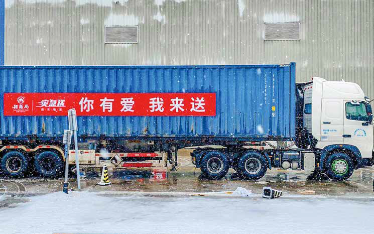2月14日,招商局集團救災物流平臺——“災急送”緊急調用中國外運專業運輸車輛,頂風冒雪從北京出發,運輸3 噸醫用酒精馳援湖北省蘄春縣人民醫院 (諸維峻 攝)