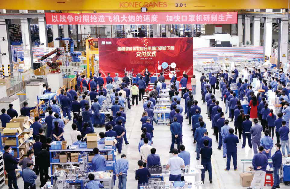 3月8日下午5時整,經過30天奮戰,國機集團下屬國機智能第100臺口罩機在廣州下線 (廖夢潔 攝)