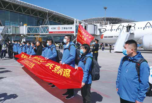 3月28日,國航CA085 包機運送山東省赴英國聯合工作組一行15人飛赴倫敦,同機運送的還有17.5噸防疫物資(孫剛 攝)