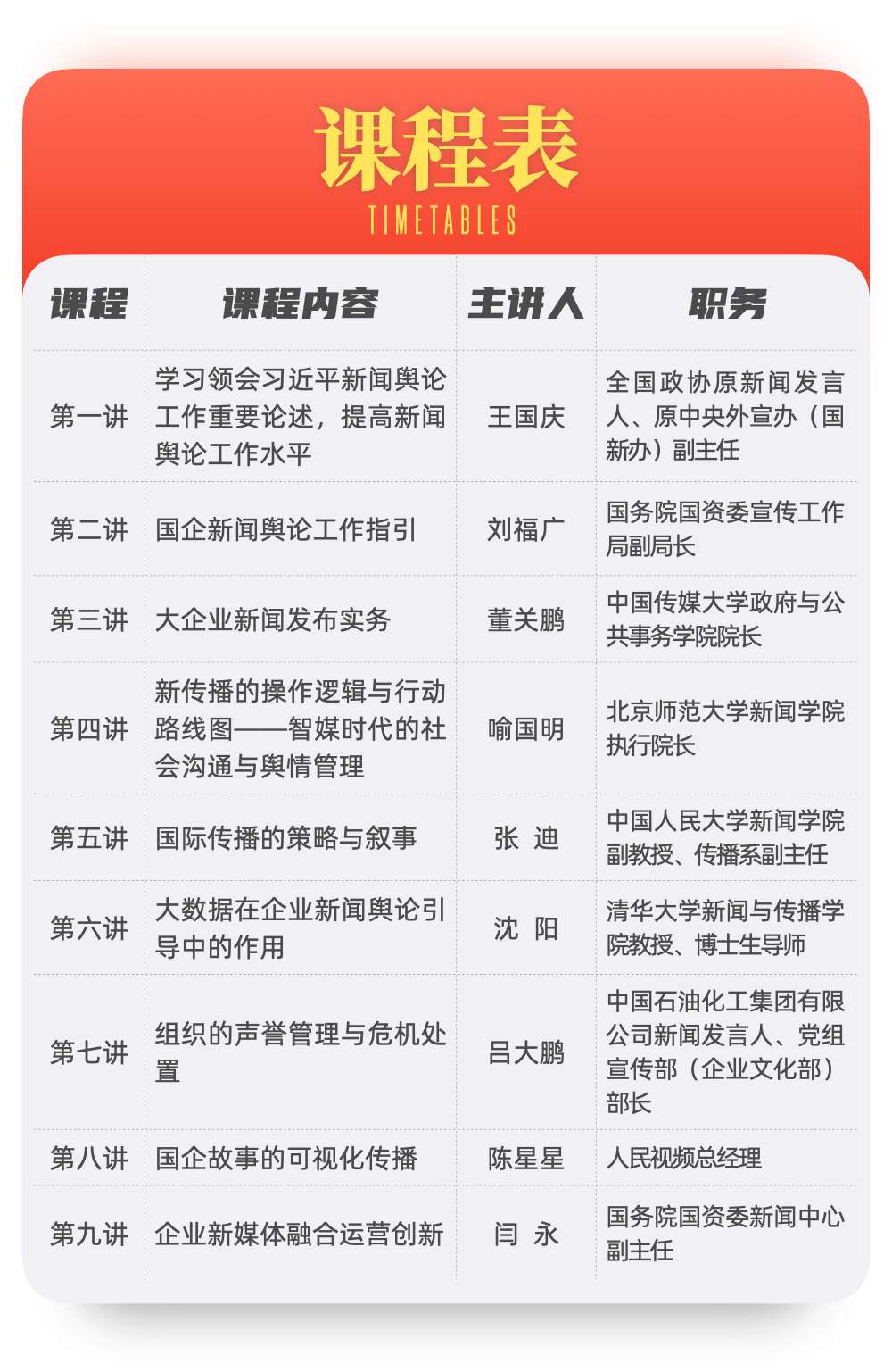 這次培訓結(jie)合國企(qi)實際設置了(le)9門精品課程,從政策解(jie)讀、理論研究、經驗(yan)總結(jie),到案例解(jie)析、實戰演練,著力(li)提升國有企(qi)業的(de)全(quan)媒體引導(dao)輿論能力(li)。