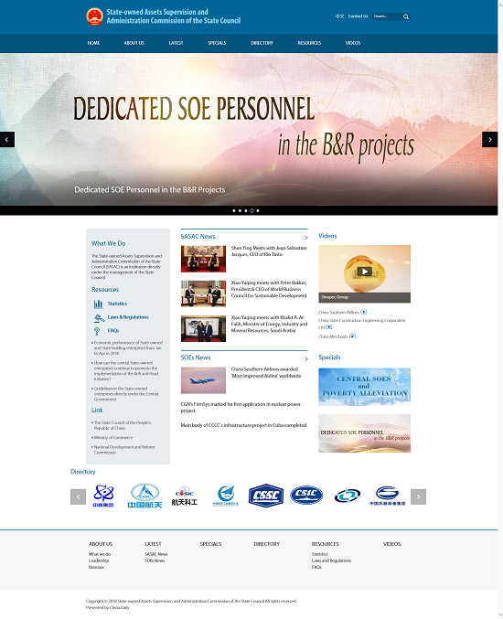 目(mu)前(qian)國(guo)(guo)務院國(guo)(guo)資委網(wang)站英文版已經編譯并上傳涉及(ji)國(guo)(guo)資央企(qi)的(de)信息168條,3個專(zhuan)題欄目(mu)。整個網(wang)站涵蓋內(nei)容(rong)更(geng)加(jia)全面,呈(cheng)現(xian)(xian)方(fang)(fang)式更(geng)加(jia)豐富,在實現(xian)(xian)傳播效果和(he)改進用戶體驗(yan)方(fang)(fang)面做足了功夫。同時,網(wang)站內(nei)容(rong)也將側(ce)重關注國(guo)(guo)際交流(liu)、央企(qi)海外業務動(dong)態等,從國(guo)(guo)際視角看中(zhong)國(guo)(guo)國(guo)(guo)有(you)資產監管(guan)和(he)國(guo)(guo)企(qi)改革發展(zhan)。