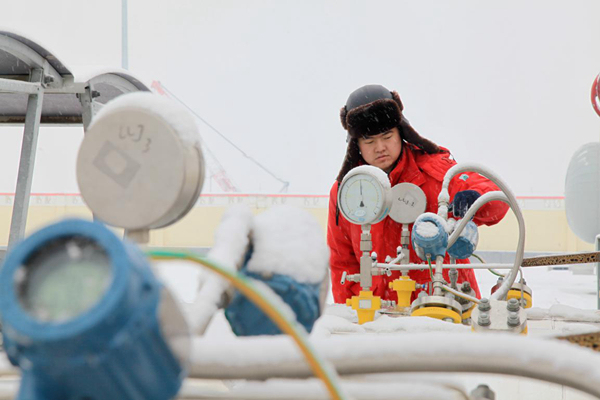 圖為中國石油西部管道霍爾果斯壓氣首站員工清除壓力表周圍的積雪。(資料圖片)