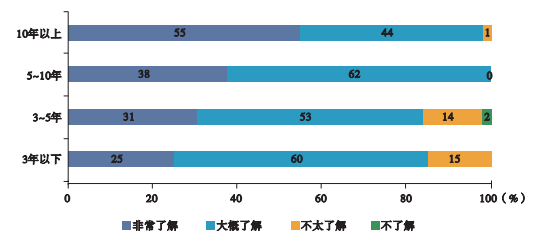 對東道國環境相關法律法規的了解程度(按海外業務年(nian)限(xian)劃分)