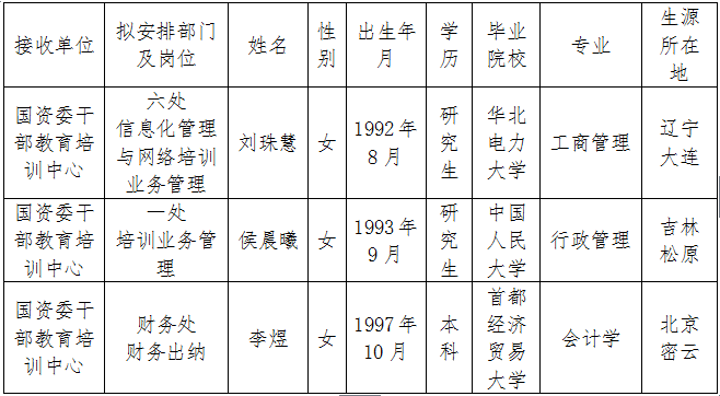 根據(ju)《國資(zi)委干(gan)部(bu)教育(yu)培訓中心(xin)2019年(nian)度高校畢業(ye)生招聘工作方案》,按照“公(gong)(gong)開、平等、競爭、擇(ze)優”的(de)原(yuan)則,經公(gong)(gong)開報名(ming)、資(zi)格(ge)審(shen)查(cha)、筆試(shi)、面試(shi)、體檢等程(cheng)序,并經主任辦公(gong)(gong)會研究決定,現(xian)將公(gong)(gong)開招聘的(de)擬聘人選公(gong)(gong)示如下(xia):