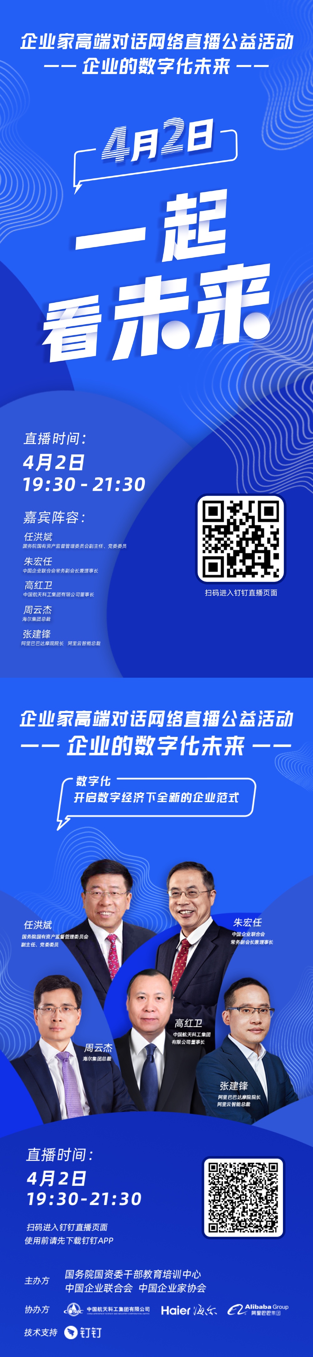 4月(yue)2日19:30-21:30,國(guo)務(wu)院國(guo)資(zi)委(wei)(wei)(wei)干部(bu)教育培訓中(zhong)心攜手(shou)中(zhong)國(guo)企(qi)業(ye)聯(lian)合會 中(zhong)國(guo)企(qi)業(ye)家協(xie)會舉辦“企(qi)業(ye)的數字化未來(lai)”企(qi)業(ye)家高(gao)端對話網絡直播公(gong)益活動。國(guo)資(zi)委(wei)(wei)(wei)副主(zhu)任(ren)、黨委(wei)(wei)(wei)委(wei)(wei)(wei)員任(ren)洪斌(bin)致辭,中(zhong)企(qi)聯(lian)常務(wu)副會長(chang)(chang)兼理事(shi)長(chang)(chang)朱宏任(ren)主(zhu)持,對話航天科(ke)工董事(shi)長(chang)(chang)高(gao)紅(hong)衛,海爾集團總(zong)裁周云(yun)杰,阿里(li)(li)巴(ba)巴(ba)達摩(mo)院院長(chang)(chang)、阿里(li)(li)云(yun)智能總(zong)裁張建鋒。敬請(qing)期待!