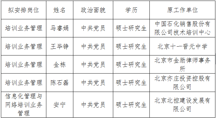 根據事業(ye)單位公(gong)(gong)開招聘相(xiang)關規定,按照“公(gong)(gong)開、平等、競爭、擇優”的原則,國務(wu)院國資委干教中心(xin)先后完(wan)成(cheng)公(gong)(gong)開報名(ming)、資格(ge)審(shen)查、基(ji)礎能力筆試、面試、業(ye)務(wu)能力筆試、體檢、考察等程序,經研(yan)究,擬聘用以下人員到中心(xin)工作,現公(gong)(gong)示如下: