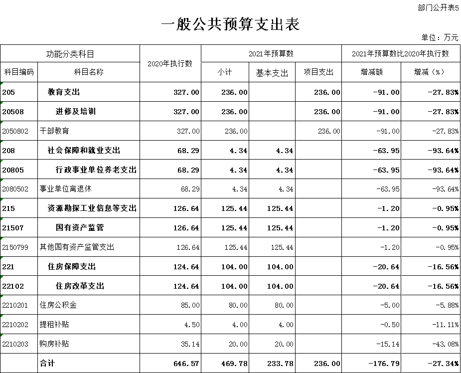 教育支出236萬元,占50.24%;社會保障和就業支出4.34萬元,占0.92%;資源勘探工業信息等支出125.44萬元,占26.70%;住房保障支出104萬元,占22.14%。