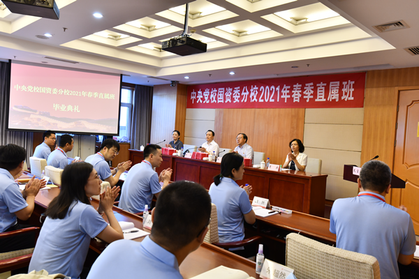 2021年7月9日上午,中央黨校國資委分校舉行2021年春季直屬班畢業典禮。中央黨校(國家行政學院)教務部和國資委干部教育培訓中心負責同志出席并講話。2名學員代表發言總結了學習情況,來自中央企業和國資委機關、直屬單位、委管行業協會及管理局系統80名直屬青年干部培訓班學員參加了畢業典禮。27名學員被評為優秀學員,17名學員的畢業論文被評為優秀畢業論文。