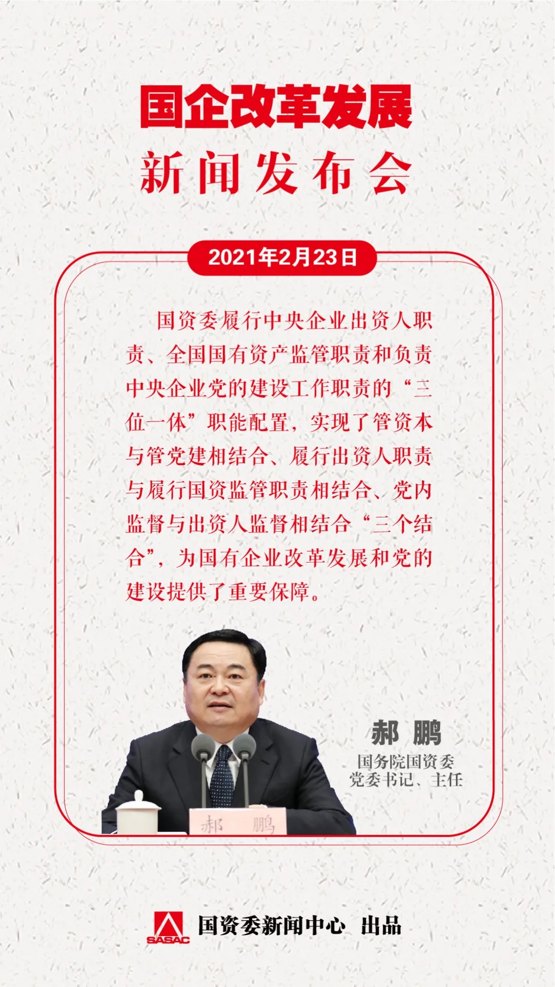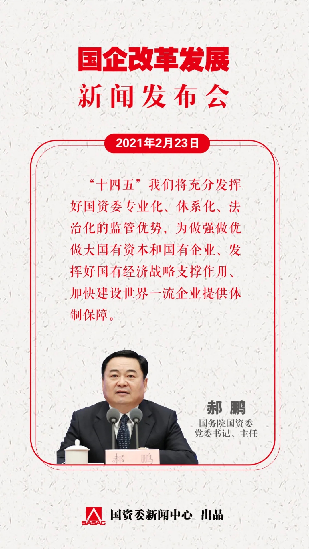 2月23日,國(guo)務院國(guo)資委(wei)黨委(wei)書(shu)記、主任郝鵬(peng)應邀出席(xi)國(guo)務院新(xin)(xin)(xin)聞(wen)辦舉行的新(xin)(xin)(xin)聞(wen)發(fa)布(bu)會(hui),介紹國(guo)資國(guo)企發(fa)展改(gai)革(ge)監管和黨的建(jian)設工作情(qing)況(kuang),并就如何深化國(guo)企改(gai)革(ge)、加大科技創新(xin)(xin)(xin)、完善國(guo)資監管體(ti)制、參(can)與(yu)共建(jian)“一(yi)帶一(yi)路”、推(tui)進重組(zu)整合(he)、防范化解金融(rong)風險等,回答了中外(wai)媒體(ti)記者(zhe)提問(wen)。國(guo)務院國(guo)資委(wei)秘(mi)書(shu)長、新(xin)(xin)(xin)聞(wen)發(fa)言人彭華崗(gang)參(can)加新(xin)(xin)(xin)聞(wen)發(fa)布(bu)會(hui),并回答了有(you)關問(wen)題。