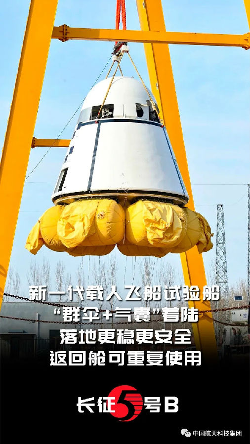 飛船返(fan)回艙(cang)穿著新(xin)研制(zhi)的(de)“防熱衣(yi)”返(fan)回,頭頂群傘(san)腳踩“氣球”著陸,航(hang)天員落地更穩、更安全,返(fan)回艙(cang)還能重復(fu)使用。