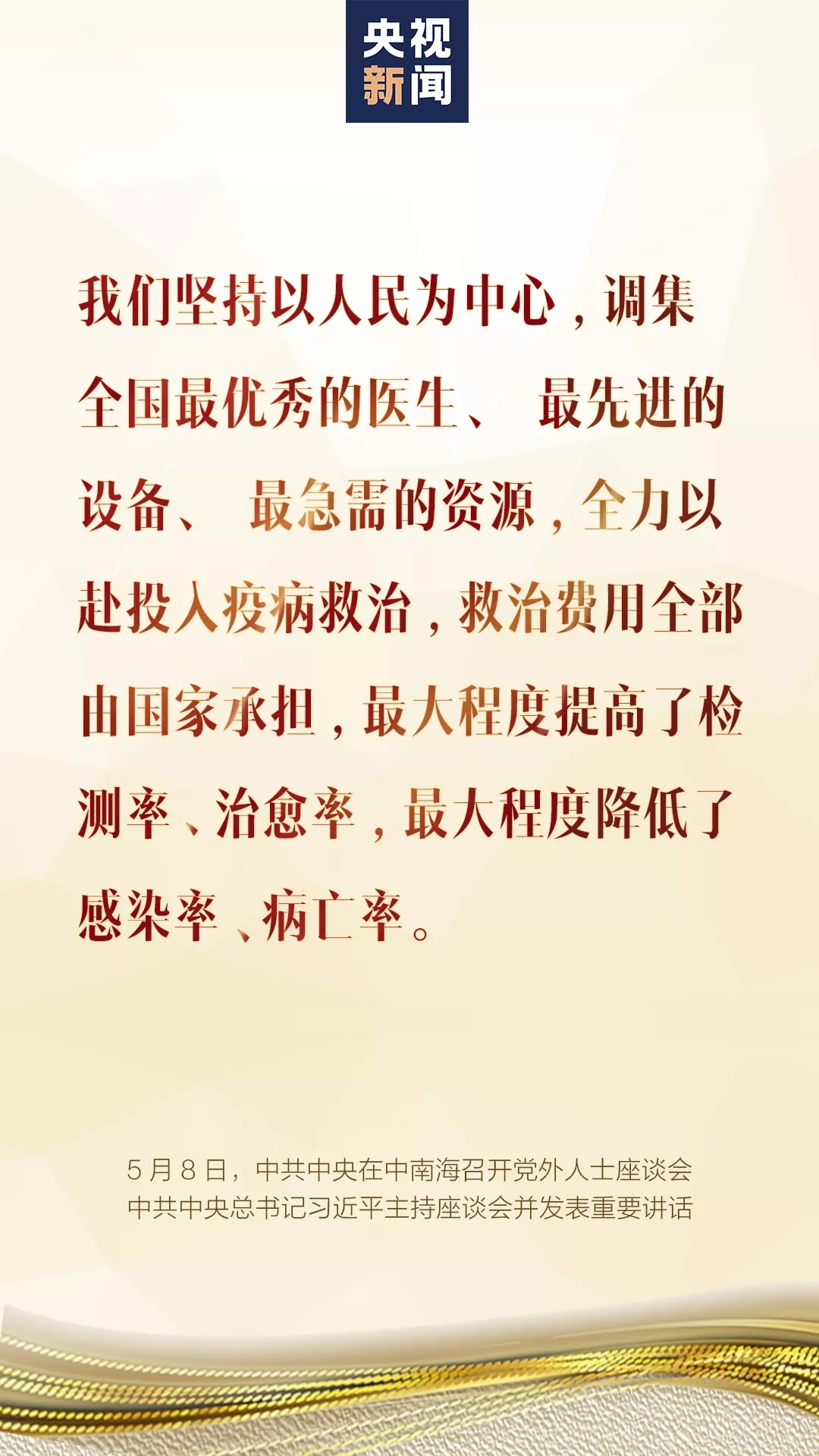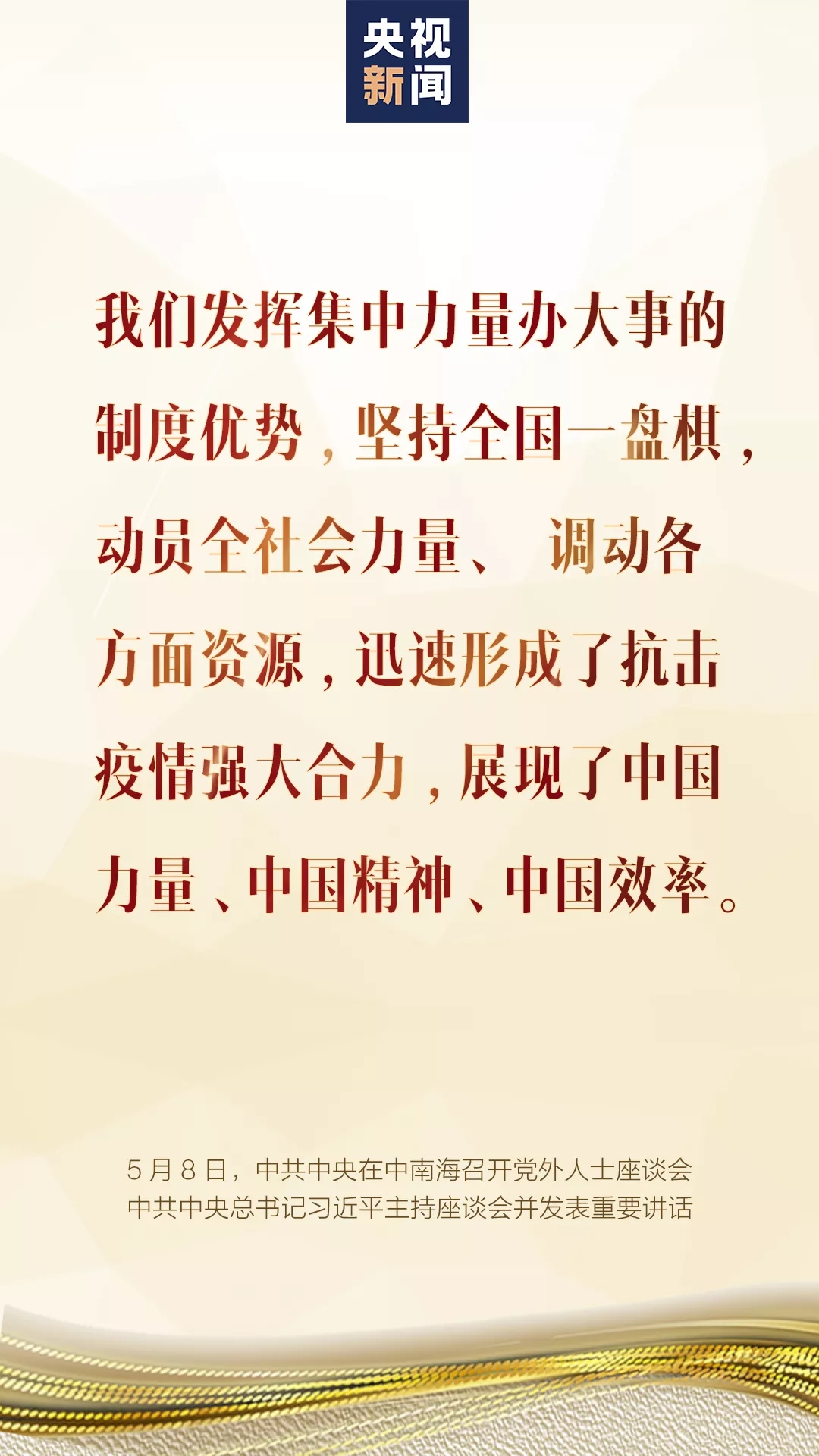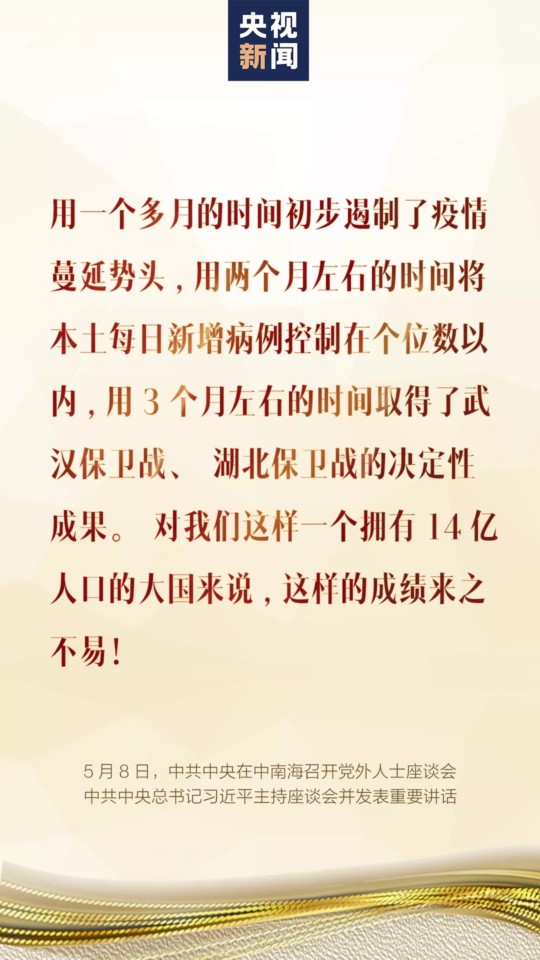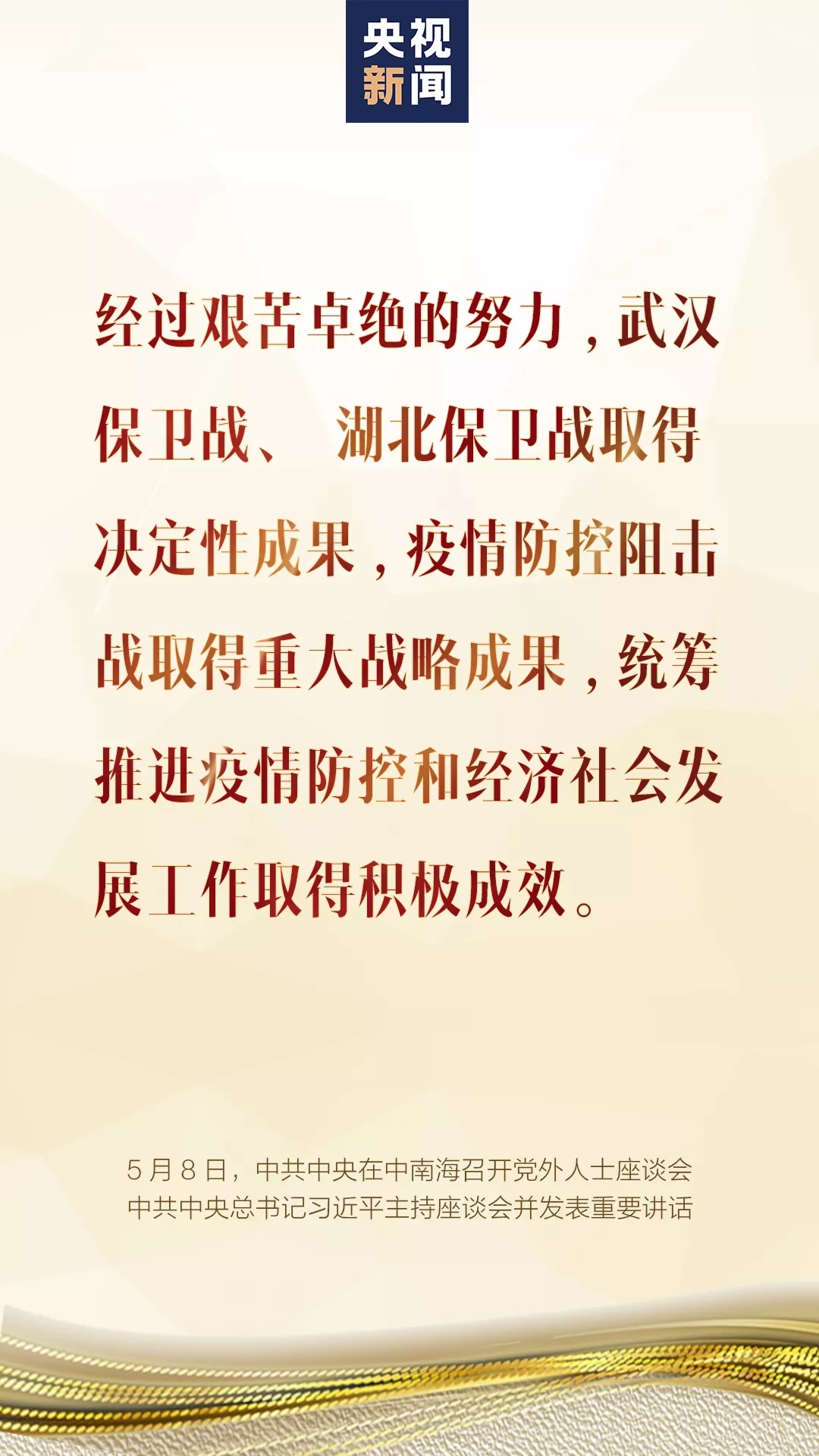 5月(yue)8日,中(zhong)共中(zhong)央在中(zhong)南海召開黨(dang)(dang)外人士座談(tan)會,就新冠肺炎疫情(qing)防控工作聽取各(ge)民(min)主黨(dang)(dang)派中(zhong)央、全(quan)國工商聯(lian)和無黨(dang)(dang)派人士代表(biao)的意見(jian)和建議。中(zhong)共中(zhong)央總(zong)書記習近平(ping)主持座談(tan)會并發(fa)表(biao)重要講話。