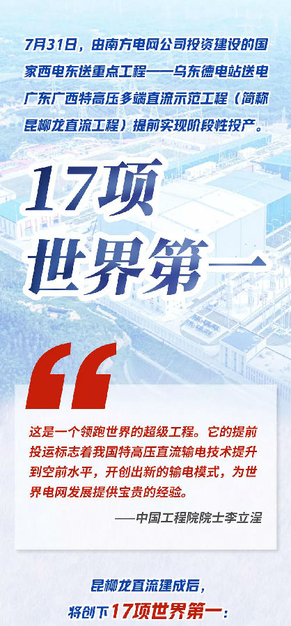 7月31日(ri),由南方(fang)電(dian)網公司投資建設的國家西(xi)電(dian)東送重點(dian)工程(cheng)——烏東德電(dian)站送電(dian)廣(guang)東廣(guang)西(xi)特高壓多端直(zhi)流(liu)示(shi)范(fan)工程(cheng)(簡稱昆(kun)柳龍直(zhi)流(liu)工程(cheng))提前實現(xian)階段性投產(chan)。該工程(cheng)將創造17項世(shi)界第(di)一(yi),全部(bu)建成(cheng)后每年增送西(xi)部(bu)清潔水電(dian)330億(yi)度。