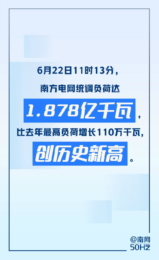 6月22日11時13分,南方電網(wang)統調(diao)負荷達1.878億千瓦(wa)(wa),比去年最高(gao)負荷增長(chang)110萬(wan)千瓦(wa)(wa),創下歷史新高(gao)。