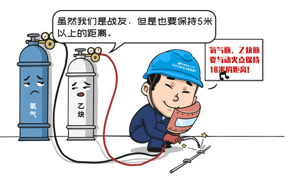 氧(yang)氣瓶、乙(yi)炔瓶要與動火點保持至少10米的距離,氧(yang)氣瓶與乙(yi)炔瓶的距離應保持8米以上。