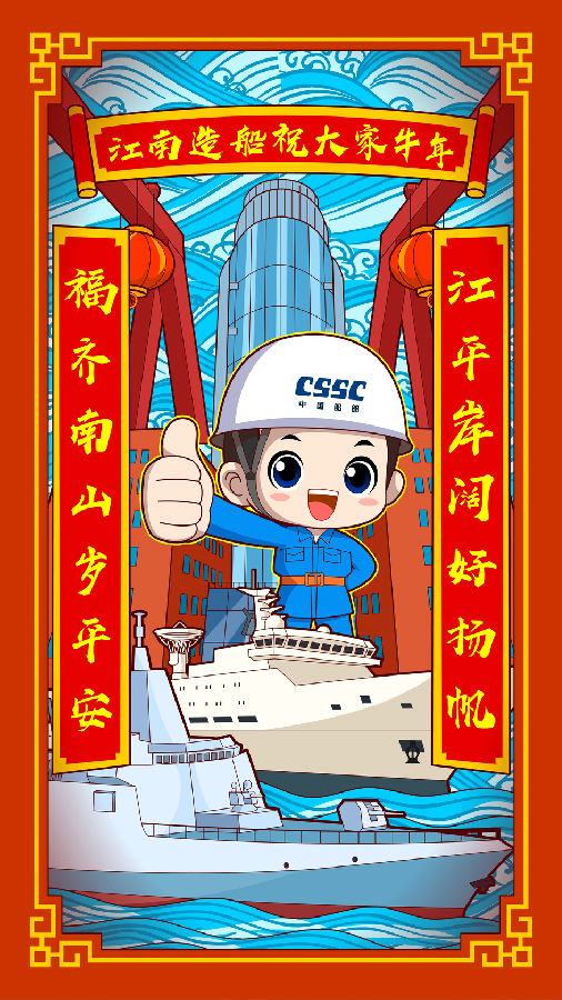 中國(guo)(guo)船(chuan)(chuan)(chuan)舶集(ji)團旗下江南(nan)(nan)造(zao)船(chuan)(chuan)(chuan)(集(ji)團)有限(xian)責任公司(si)采用國(guo)(guo)潮(chao)畫風整體設(she)計,元素(su)(su)選(xuan)取江南(nan)(nan)造(zao)船(chuan)(chuan)(chuan)卡通(tong)形(xing)象、江南(nan)(nan)造(zao)船(chuan)(chuan)(chuan)典型(xing)建筑(行政樓&研(yan)究院)、重點(dian)產(chan)品以及龍門吊,通(tong)過“人(ren)”“船(chuan)(chuan)(chuan)”“樓”“機”四(si)種(zhong)元素(su)(su),完(wan)美詮釋愛國(guo)(guo)精神。