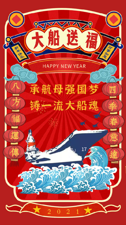 中國船(chuan)(chuan)舶集團旗下大連船(chuan)(chuan)舶重工集團有限公司設計的(de)(de)(de)海報使(shi)用紅色(se)背景,充滿喜(xi)慶祥和的(de)(de)(de)節日氛圍(wei)。中心位(wei)置是由大船(chuan)(chuan)集團建造的(de)(de)(de)“山東艦(jian)”,乘風破(po)浪,勇敢前行,承(cheng)載了“愛(ai)國、創新(xin)、科學、拼搏(bo)、協作”的(de)(de)(de)航母精神。