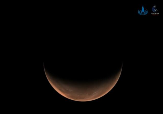 天問(wen)一(yi)號探測器飛(fei)行至距(ju)離(li)火星1.1萬(wan)千米處(chu),利用(yong)中分辨率相機拍攝(she)了火星全景(jing)。此時(shi),由于探測器處(chu)于火星側后方(fang)上空(以面向(xiang)太陽為前(qian)方(fang)),得到兩幅“側身(shen)”影像。