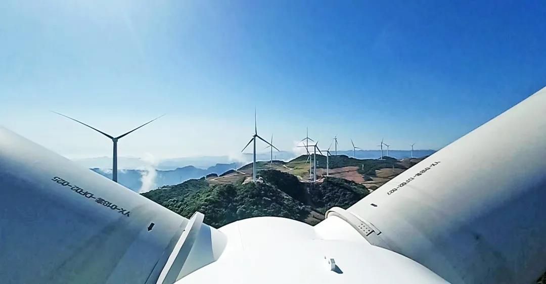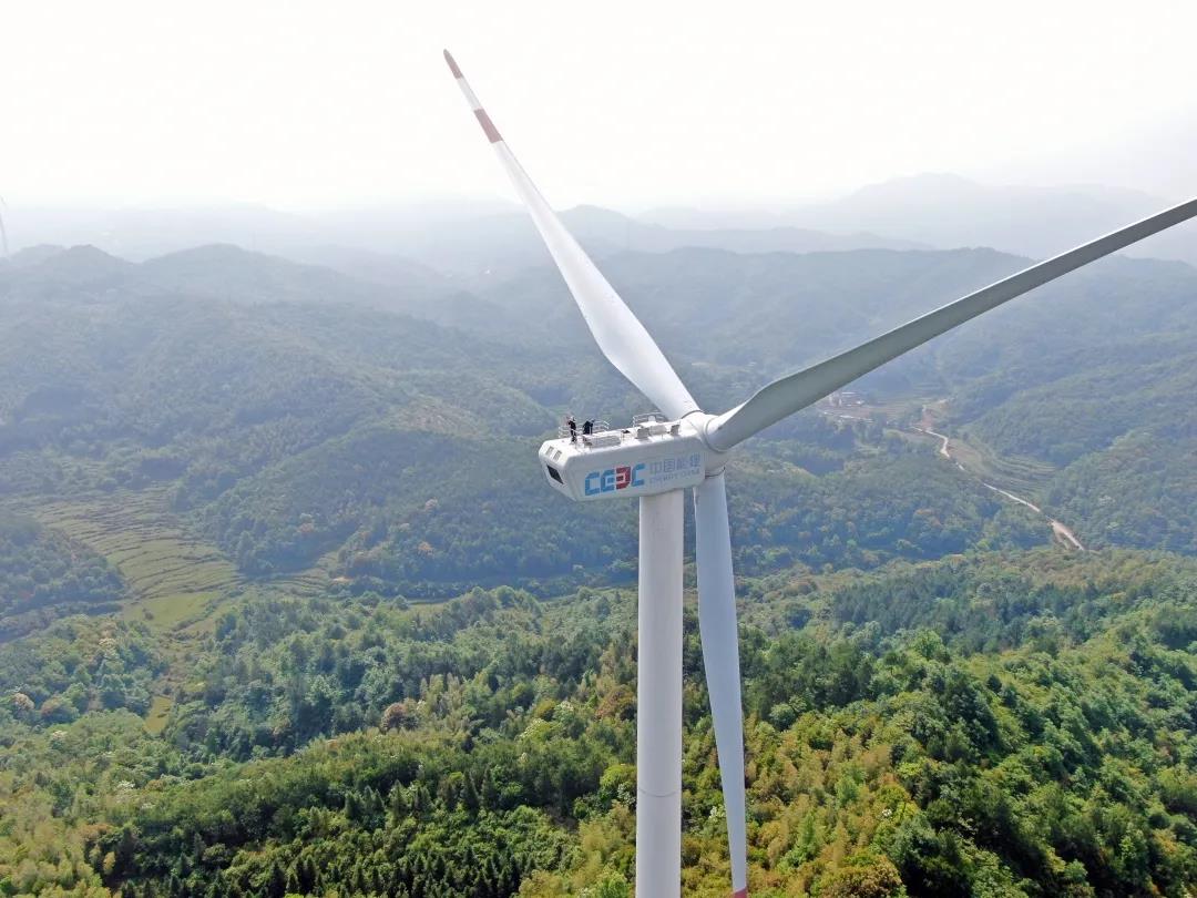 4月22日10時18分,中國能建韶關南雄犁牛坪風電場,檢修人員登高作業巡檢。