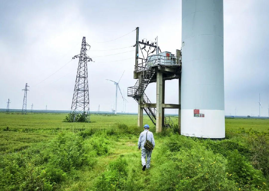 4月22日10時55分,安徽電建二公司宿松新州渡風電檢修維護項目現場,檢修工正前往風機,開展箱變巡檢。