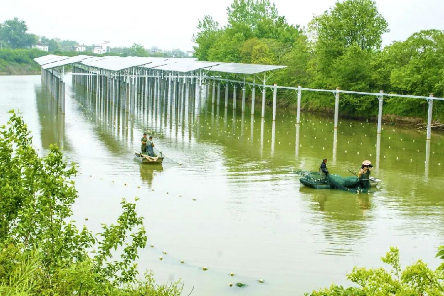 4月22日16時30分,安徽電建二公司承建的無為市40兆瓦漁光互補光伏發電項目現場,漁民在光伏區捕魚。