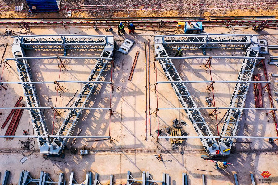2020年10月1日,施工人(ren)員將鋼(gang)三角(jiao)桿(gan)件按照模板(ban)位置拼裝焊接成(cheng)統(tong)一的規格(ge),以方便后續安裝。