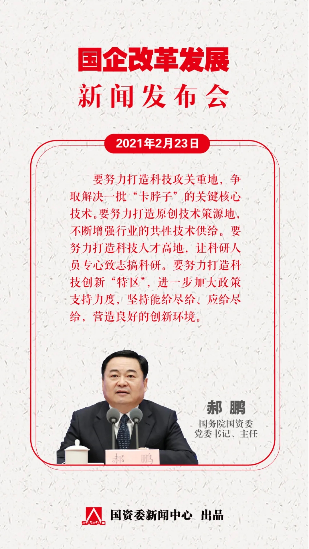 2月23日,國(guo)(guo)務院國(guo)(guo)資(zi)委黨(dang)委書記、主任郝鵬應邀出席國(guo)(guo)務院新聞(wen)辦舉行的新聞(wen)發(fa)布會(hui),介紹國(guo)(guo)資(zi)國(guo)(guo)企(qi)發(fa)展(zhan)改革監(jian)管(guan)和黨(dang)的建設(she)工作情(qing)況(kuang),并就如何深(shen)化國(guo)(guo)企(qi)改革、加大(da)科(ke)技(ji)創新、完善國(guo)(guo)資(zi)監(jian)管(guan)體制(zhi)、參與共建“一帶一路(lu)”、推進重(zhong)組整合、防范化解(jie)金(jin)融風險等,回答了(le)中外媒體記者提問。國(guo)(guo)務院國(guo)(guo)資(zi)委秘書長、新聞(wen)發(fa)言人彭華崗(gang)參加新聞(wen)發(fa)布會(hui),并回答了(le)有(you)關問題。