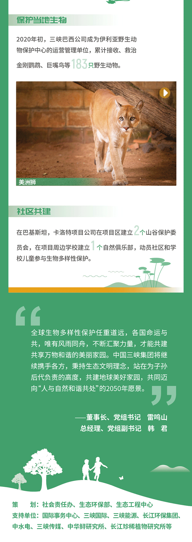 報告深(shen)入貫(guan)(guan)徹習近(jin)平主(zhu)席(xi)在(zai)《生(sheng)(sheng)物多(duo)樣(yang)性公約》第十五(wu)次締約方(fang)大(da)會上(shang)的(de)(de)主(zhu)旨講話精神(shen),以“守護多(duo)樣(yang)之美、共(gong)(gong)(gong)建(jian)地(di)球家(jia)園(yuan)”為主(zhu)題,通過“和(he)(he)諧共(gong)(gong)(gong)生(sheng)(sheng)構建(jian)人與自然(ran)和(he)(he)諧共(gong)(gong)(gong)生(sheng)(sheng)的(de)(de)地(di)球家(jia)園(yuan)”“協(xie)同(tong)共(gong)(gong)(gong)進 構建(jian)經濟與環境協(xie)同(tong)共(gong)(gong)(gong)進的(de)(de)地(di)球家(jia)園(yuan)”“全球共(gong)(gong)(gong)榮 構建(jian)世界各國共(gong)(gong)(gong)同(tong)發(fa)(fa)展(zhan)的(de)(de)地(di)球家(jia)園(yuan)”三(san)大(da)篇章(zhang),以簡潔(jie)的(de)(de)文字、生(sheng)(sheng)動(dong)(dong)的(de)(de)圖片、詳實的(de)(de)內容、豐富的(de)(de)案例和(he)(he)中(zhong)(zhong)英(ying)雙(shuang)語形(xing)式(shi),詳細披露了中(zhong)(zhong)國三(san)峽集(ji)團(tuan)(tuan)在(zai)長江珍稀特有物種保護、長江流域生(sheng)(sheng)態(tai)修復、實施清潔(jie)能源和(he)(he)長江生(sheng)(sheng)態(tai)環保“兩翼(yi)齊(qi)飛”以及加強全球生(sheng)(sheng)物多(duo)樣(yang)性保護合作(zuo)(zuo)等(deng)方(fang)面作(zuo)(zuo)出(chu)的(de)(de)努力(li),生(sheng)(sheng)動(dong)(dong)詮釋了中(zhong)(zhong)國三(san)峽集(ji)團(tuan)(tuan)在(zai)助(zhu)力(li)生(sheng)(sheng)態(tai)文明建(jian)設、推動(dong)(dong)高質(zhi)量(liang)發(fa)(fa)展(zhan)和(he)(he)共(gong)(gong)(gong)建(jian)地(di)球生(sheng)(sheng)命共(gong)(gong)(gong)同(tong)體等(deng)方(fang)面的(de)(de)使命擔(dan)當(dang),彰顯了中(zhong)(zhong)國三(san)峽集(ji)團(tuan)(tuan)堅持貫(guan)(guan)徹“生(sheng)(sheng)態(tai)優(you)先、綠色發(fa)(fa)展(zhan)”理念,努力(li)“在(zai)保護中(zhong)(zhong)發(fa)(fa)展(zhan)、在(zai)發(fa)(fa)展(zhan)中(zhong)(zhong)保護,更好造福人民”的(de)(de)負責任企業(ye)形(xing)象(xiang)。