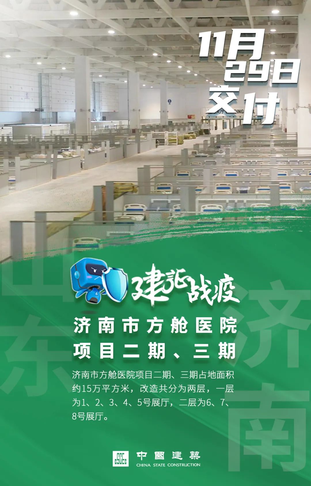 11月29日,中建(jian)八(ba)局(ju)負(fu)責規(gui)劃設計、建(jian)造的濟(ji)南市方(fang)艙醫院項目二期(qi)、三期(qi)完工。項目占地面積約15萬平方(fang)米,改造共(gong)分為兩層,共(gong)設置(zhi)8000個床位。